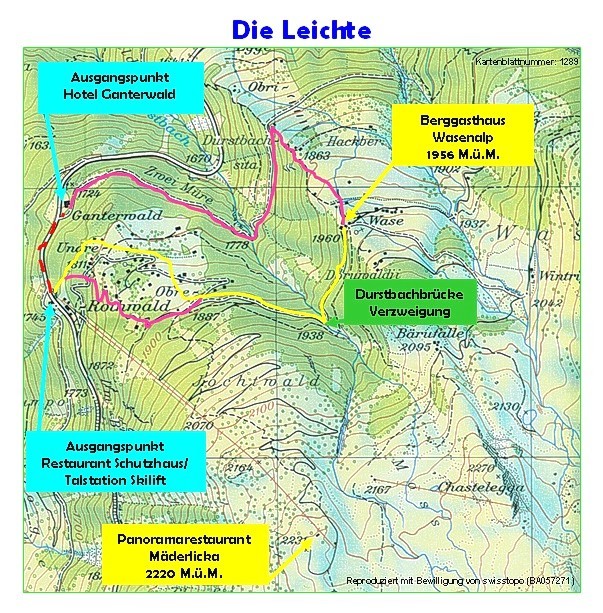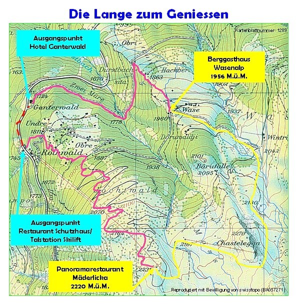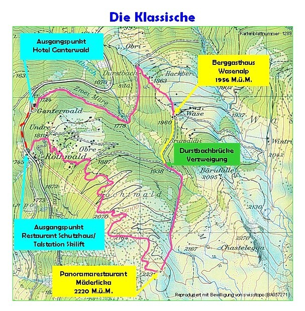 This snowshoe trail leads from the Hotel Ganterwald on the marked trail to the "Obru Egge" and from there uphill over the "Hackber" up to the Berggasthaus Wasenalp. Then the groomed slope down to the "Obru Rothwald" from there in the "Undru Rothwald" to the ski lift station Rothwald / Rest. Schutzhaus. Finally, back to the starting point via the sidewalk of the national road.